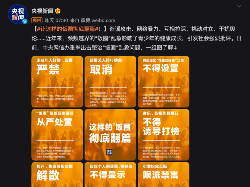 On Monday (Aug 30), the state-controlled broadcaster CCTV released a set of infographics emphasising eight of the major regulations to help drive the points home, vowing that it will work hard to “rectify the chaos in fan communities and deal with the entire entertainment industry”.