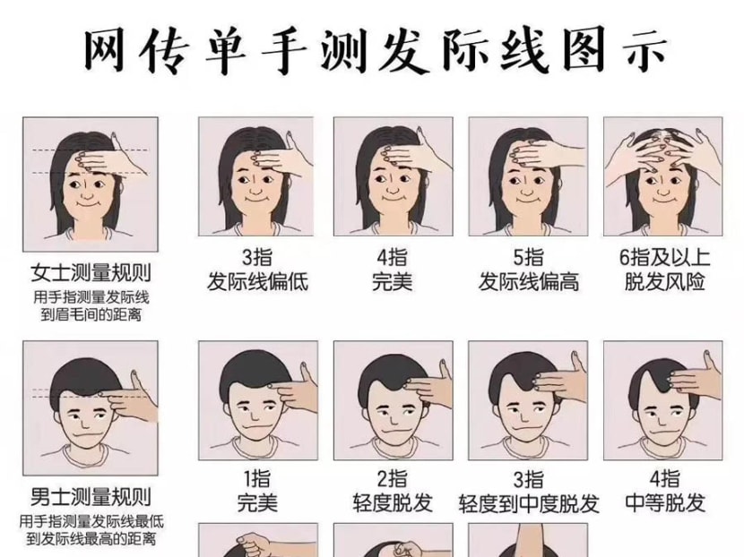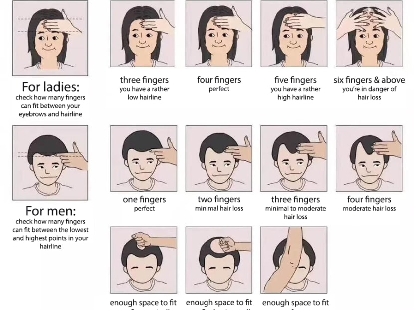All you have to do to is to check the number of fingers you can place on your forehead to your hairline, with the bar set differently for males and females.