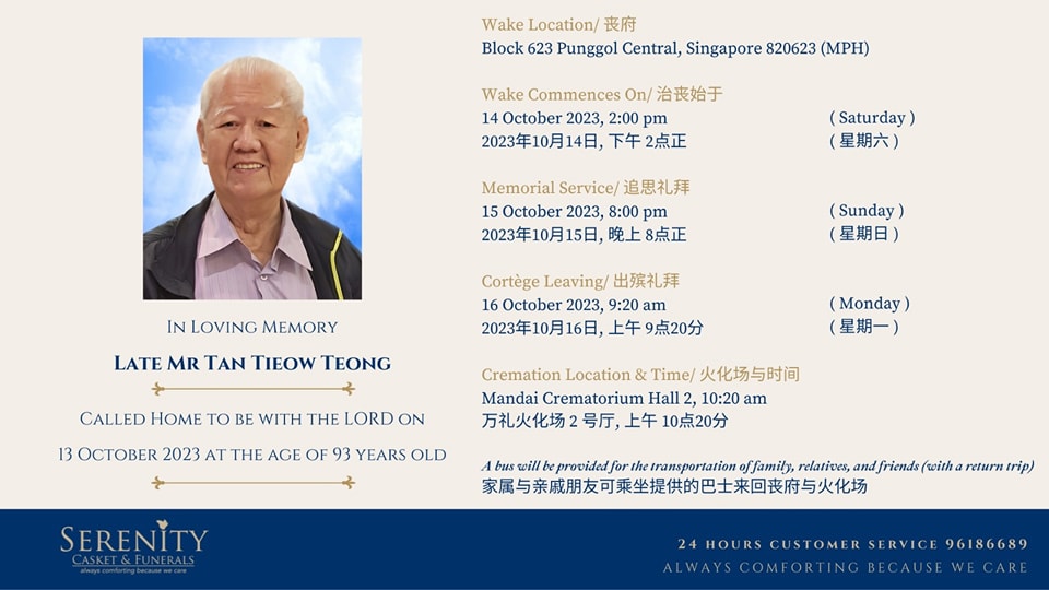 On Oct 14, Dona Manis Cake Shop announced on its Facebook page that Mr Tan had passed away aged 93 the day before.