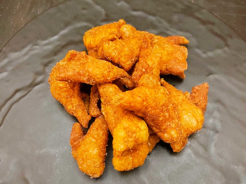 Lightly seasoned crispy fried chicken skin. They stay crisp after standing for over an hour, and we inhale it in no time even if some of us moan about it being rather under-seasoned.