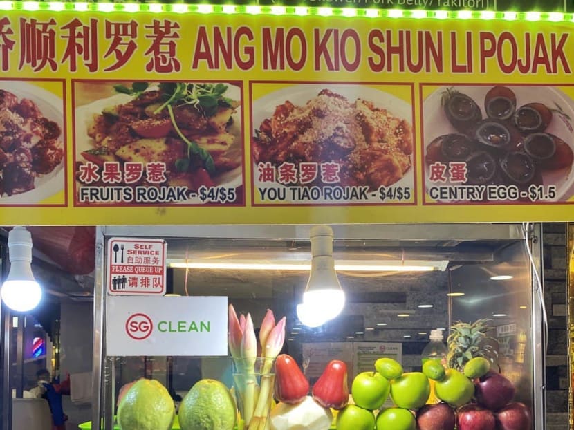 The stall looks like it’s haphazardly plonked into the empty unit left by a defunct Japanese ramen joint. There’s still a sign advertising ‘Special Sauce Ramen’ over the rojak stall’s own signboard, which is lit up with getai-esque neon lights and bears the name Ang Mo Kio Shun Li Pojak. ‘Pojak’ apparently means rojak, evidently from the neat stacks of you tiao, tau pok, jicama and an array of fruits displayed at the stall (the Ang Mo Kio Shun Li moniker, though, is a mystery).