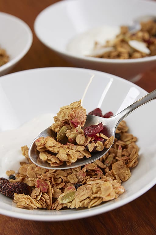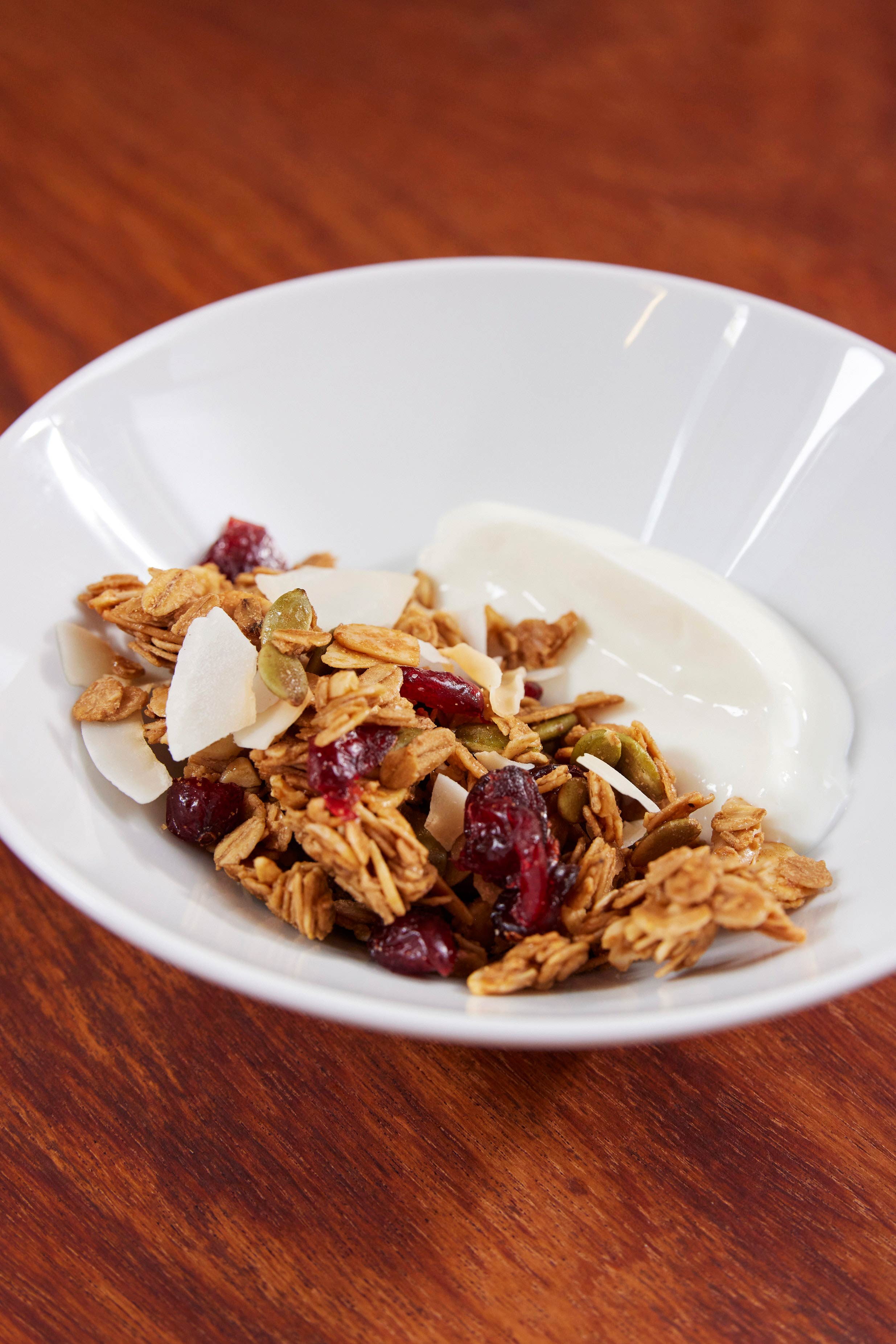 The Berries granola has organic rolled oats, dried strawberries, cranberries and blueberries, almonds and pumpkin seeds sweetened with dark brown sugar and maple syrup. It’s a divine combination of tart, earthy and sweet, though we prefer the lighter, coconutty Raglan yogurt over the tangier Chobani yogurt for our granola.