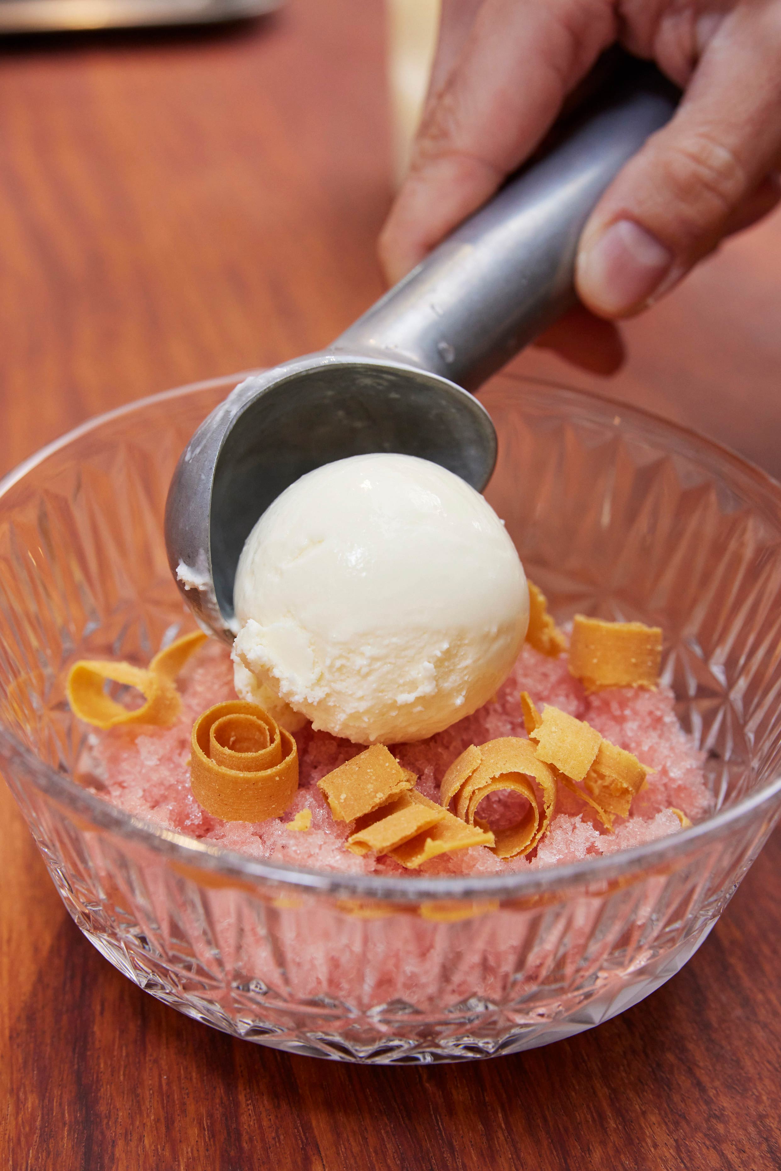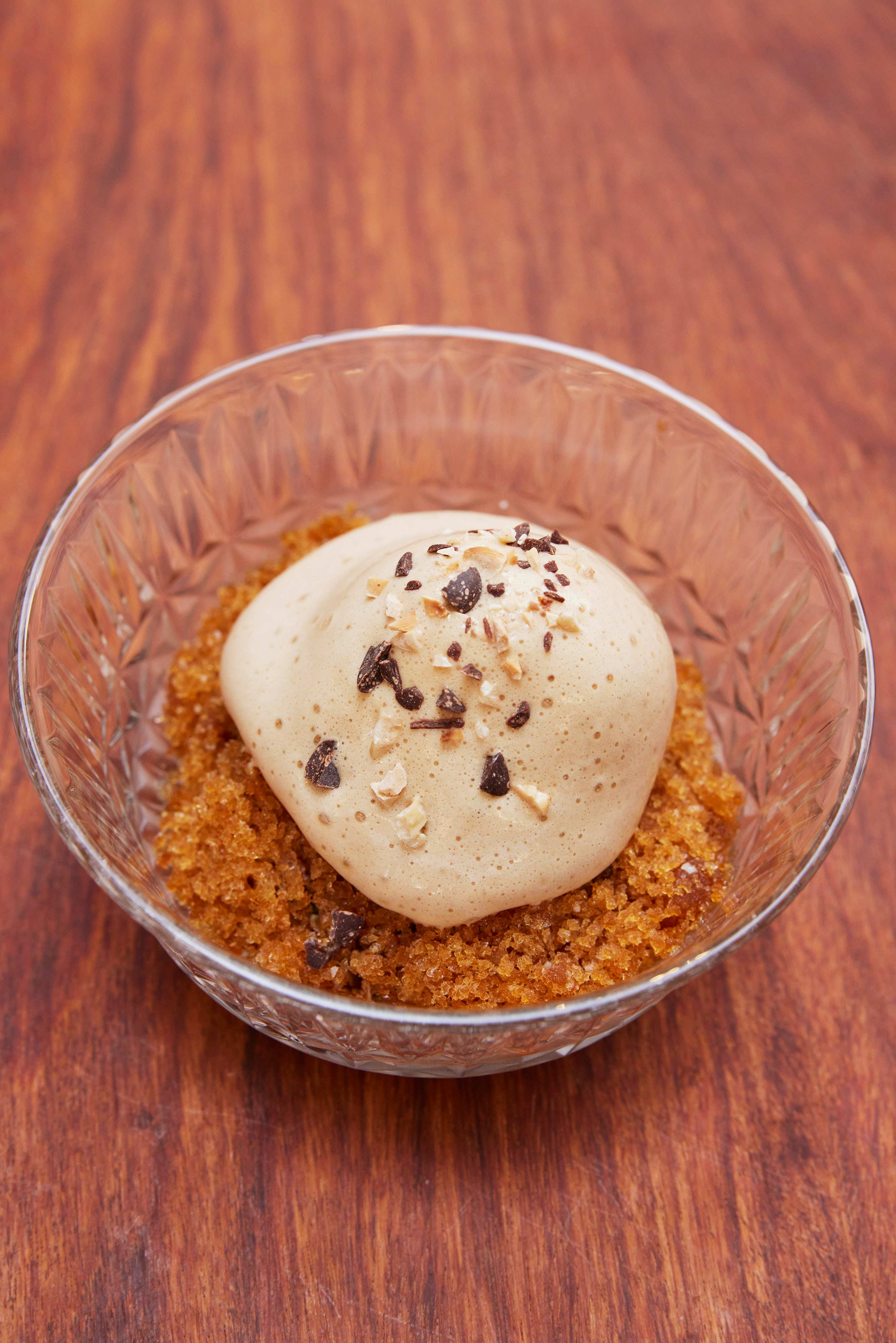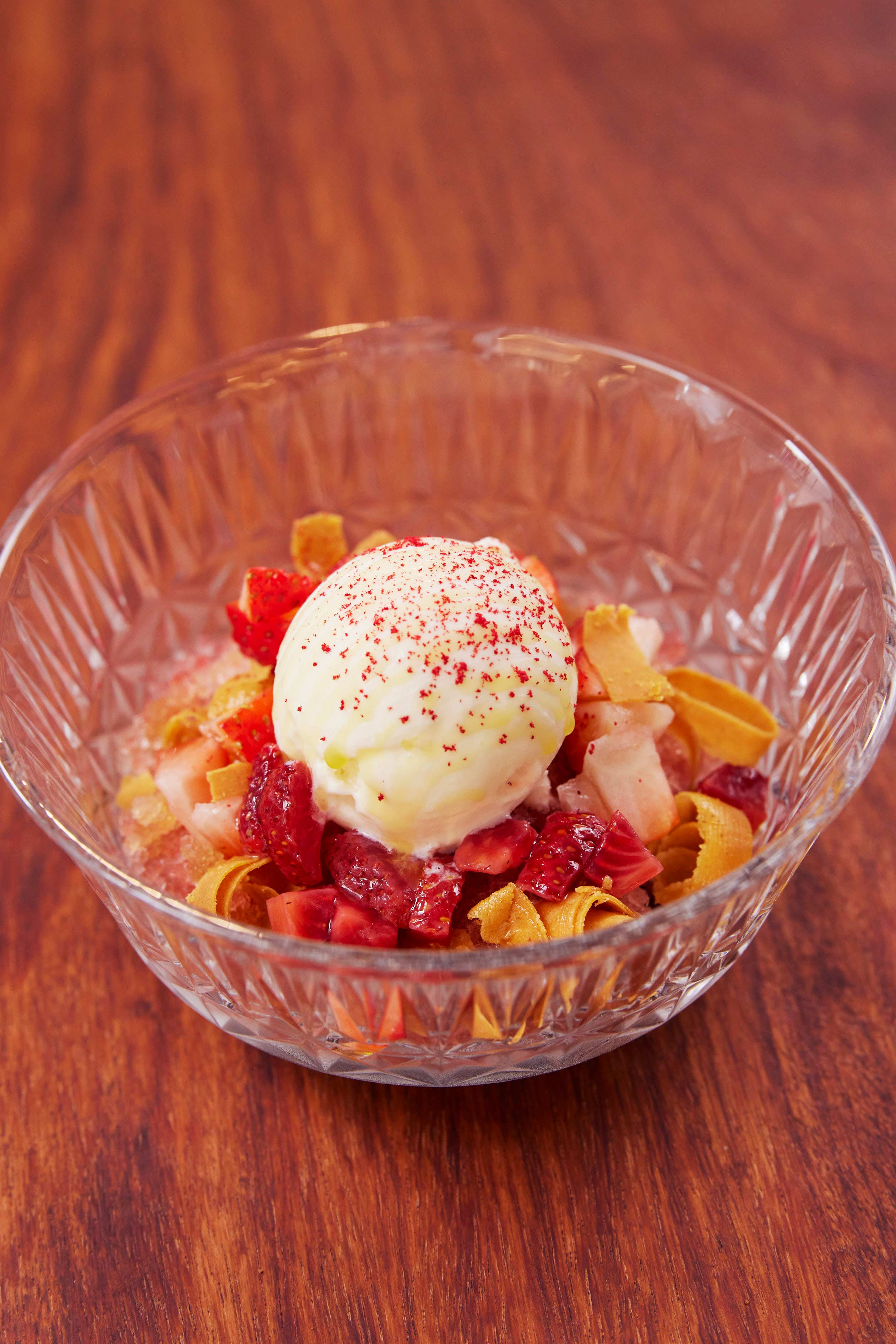 Chris pairs milk ice cream with coffee granita and hazelnut-chocolate granola for this bowl, which is carefully topped with coffee espuma (Spanish for ‘foam’) he dispenses from a metal siphon canister and a light drizzle of salt (“I always like to finish desserts with a little bit of salt.”) The ephemeral ensemble melts within a mere minute, but during that time you enjoy the sultry bitterness of the espuma and coffee granita with a dash of smooth ice cream and crunchy granola. But if you have a sweet tooth, we recommend going for the perkier Strawberries & Cream bowl; this one is for the black coffee and dark choc lovers.