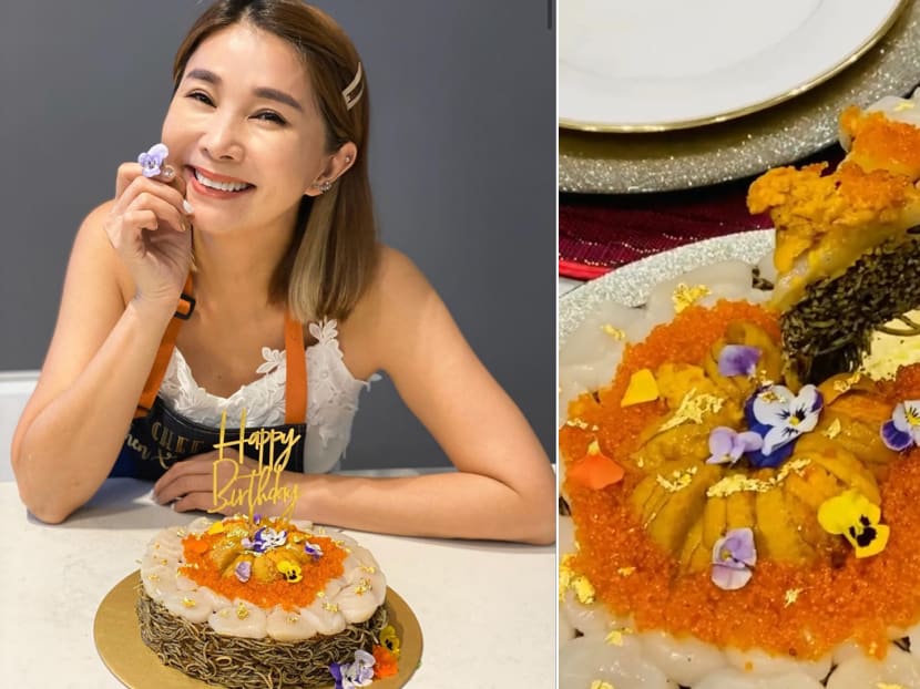 Yummy factor: Because her family doesn't have a sweet tooth, Xiuhuan decided to switch things up for her hubby’s birthday and make a savoury “cake” instead with angel hair pasta. Seasoned with truffle oil, ponzu sauce, and nori powder, the yummy carbs were topped with Hokkaido scallops, buttery uni, juicy ikura and a touch of edible gold flakes and flowers.