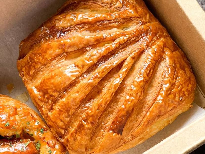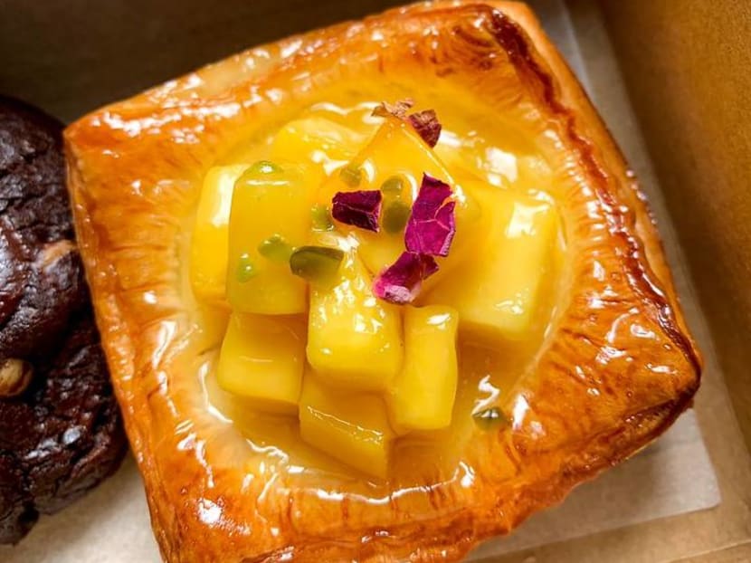 There’re also sweet danishes, including this petite number with custard cream cheese, topped with small mango bits, pistachio nuts and rose petals for an added touch. The pastry is soft and buttery — pairing nicely with the sweet mango, though we can barely taste the cream cheese. Still, quite yummy.