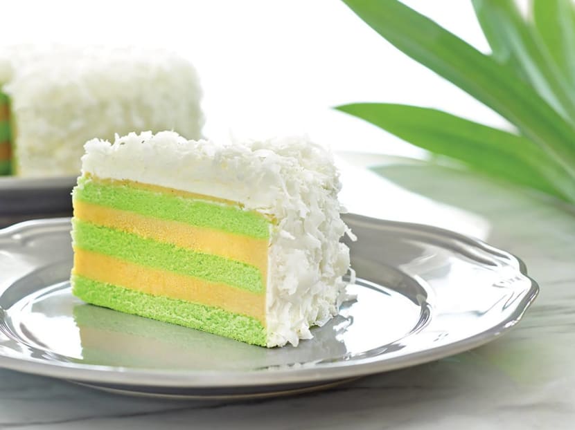 This colourful number features five layers of fluffy pandan sponge cake and D24 durian mousse, all cloaked in a coat of cream frosting and coconut flakes.