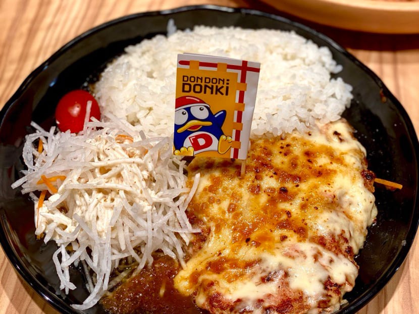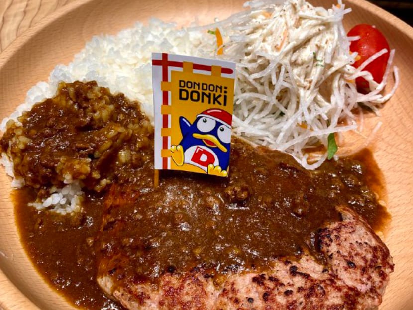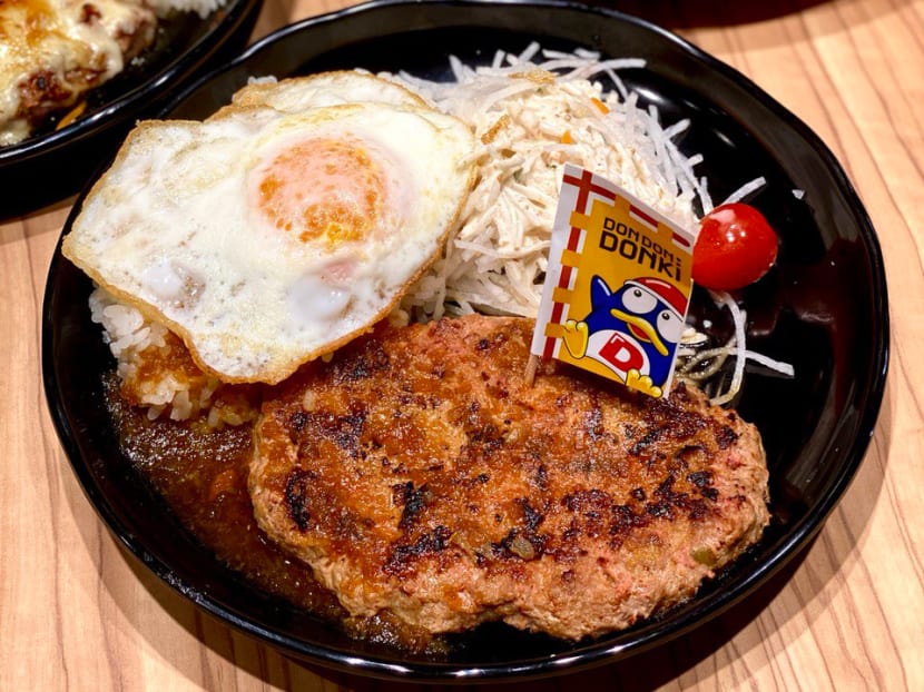 Don Don Donki’s patties are made with a mix of ground beef and pork studded with bits of chopped onions. Its wafu sauce is jazzed up with “konbu dashi, onions, garlic and soya sauce”, while its curry is made with “Japanese curry cube(s) with pork and beef cooked together” for a “fruity and sweet” flavour (according to the eatery lah).