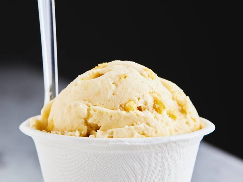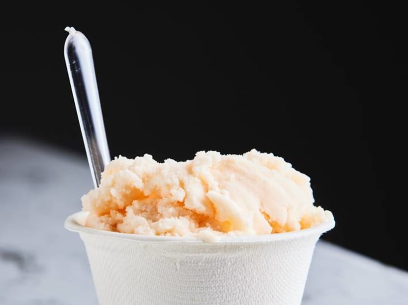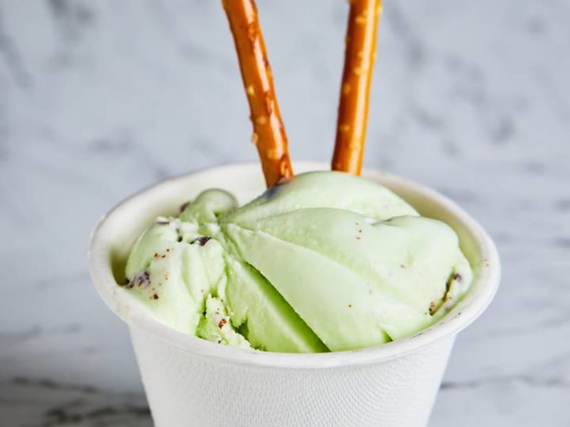 The mint hits hard in this one: sharp and floral. It’s made with fresh mint leaf extracts which gives it its pretty green hue, and comes studded with tiny bits of dark chocolate. Very nice and sophisticated. We go with the pretzel stick ‘spoons’ on this one, and they taste nondescript but are actually quite solid and functional. It’s a move to reduce plastic waste though we can’t say we prefer this over more ergonomic spoons.