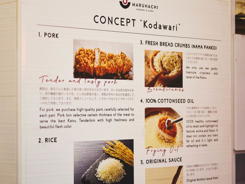 Sure, the prices are a little steep for a kopitiam stall, but August, who works in the kitchen with a few assistants, says it’s because he uses premium ingredients and restaurant techniques. For instance, Maruhachi’s premium offering of a kurobuta katsu set costs $14.80 versus the $22 from tonkatsu restaurant chain Tonkichi. August points to a sign at the shop front that advertises his “kodawari” or concept. He chooses thick-cut tenderloin and fillets of pork from the USA and Canada, and the katsu is breaded in fresh, not dried, white panko bread crumbs imported from Japan. For deep-frying, August uses 100 percent cottonseed oil, which he says has a clean, non-odorous flavour. On top of that, each katsu is breaded, fried and then sliced to order, so it comes to the table crisp and piping hot. Even the plates August uses are attractive chinaware. “To be frank, the cost is high,” he says, “but the overheads and rent are low” he says of his competitive prices, and says business has been doing well thanks mostly to word-of-mouth and good online reviews.