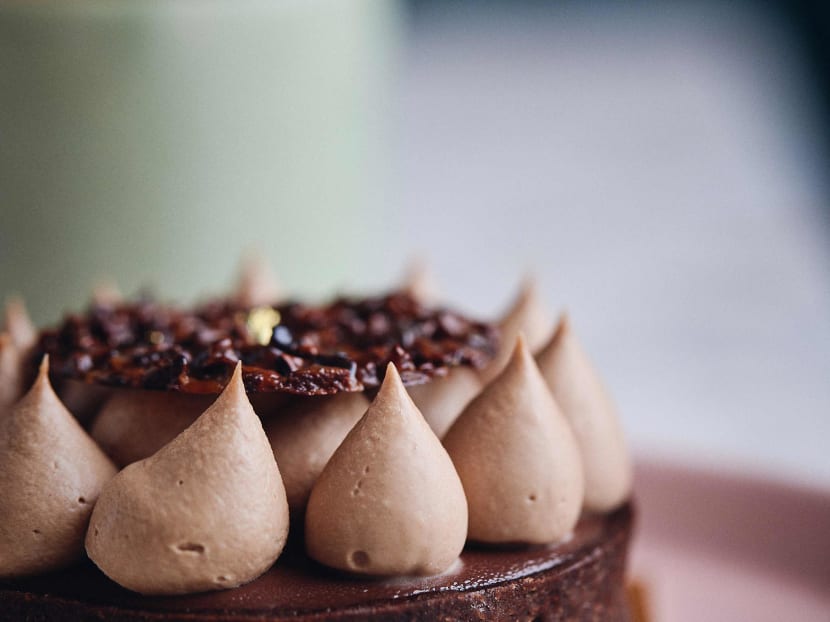 Pistachio fans will enjoy this rich orb comprising a creamy pistachio praline at its centre, a layer of pistachio frangipane (sweetened pistachio puree) and pistachio mousse. This barely sweetened confection is saturated with that distinctly earthy flavour of pistachios. Its crispy feuilletine base gives it some much needed crunch.