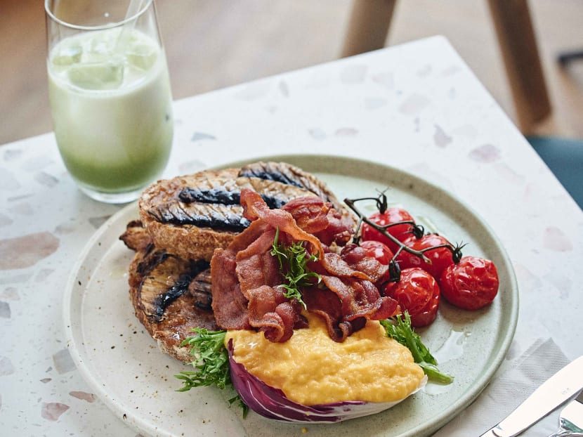 This breakfast fry-up comes with choices galore. You get to choose the type of bread you want (baguette, sourdough, ciabatta), a spread (mushroom, kombu butter, hummus, caramelised onions), eggs (scrambled, sunny side up, poached), vegetables (sauteed potatoes, vine cherry tomatoes, grilled mushrooms, avocado, sauteed seasonal veggies), and meat (spiced chicken, house-cured salmon or fried bacon). We opted for slices of sourdough, which were mildly chewy and flavourful, but not tart, spread with sweet caramelised onions. We also got sweet roasted cherry tomatoes, grilled mushrooms, scrambled eggs that were done to soft, wobbly perfection and exemplary rashers of fried bacon. This is a great value-for-money big breakfast, if you ask us.