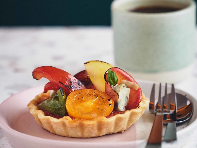 This simple teatime treat is perfect for those who don’t have a sweet tooth. The buttery pastry case spread with tomato concasse (seedless and skinless tomato sauce) is crisp when we cut through it and contrasted by sweet wedges of lightly grilled heirloom tomatoes and delicately tangy leaves of pickled artichoke hearts.