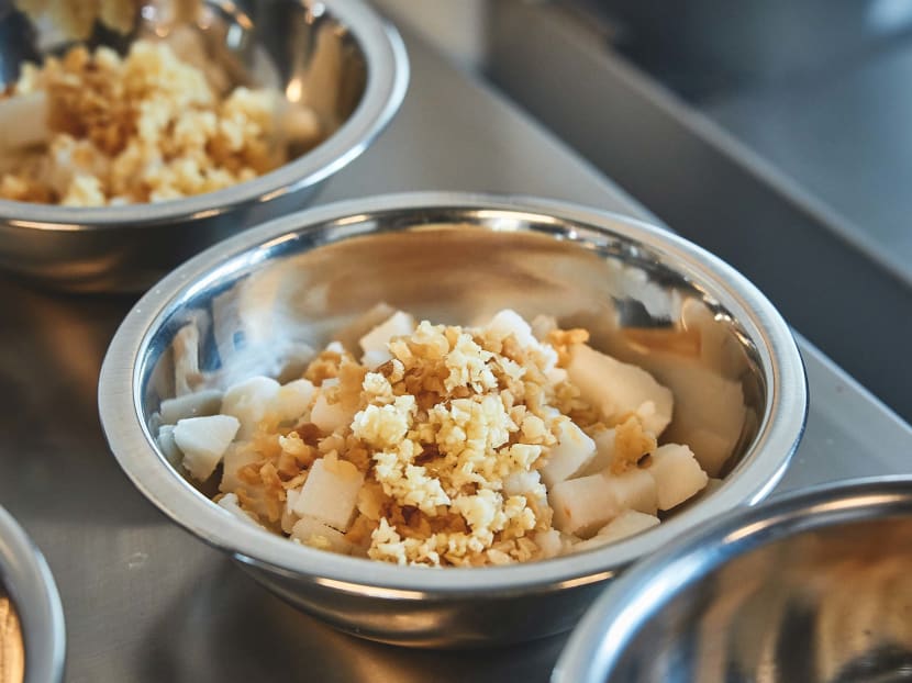 The deep-fried crisp garnish adds some texture to the velvety egg and radish cake mix.