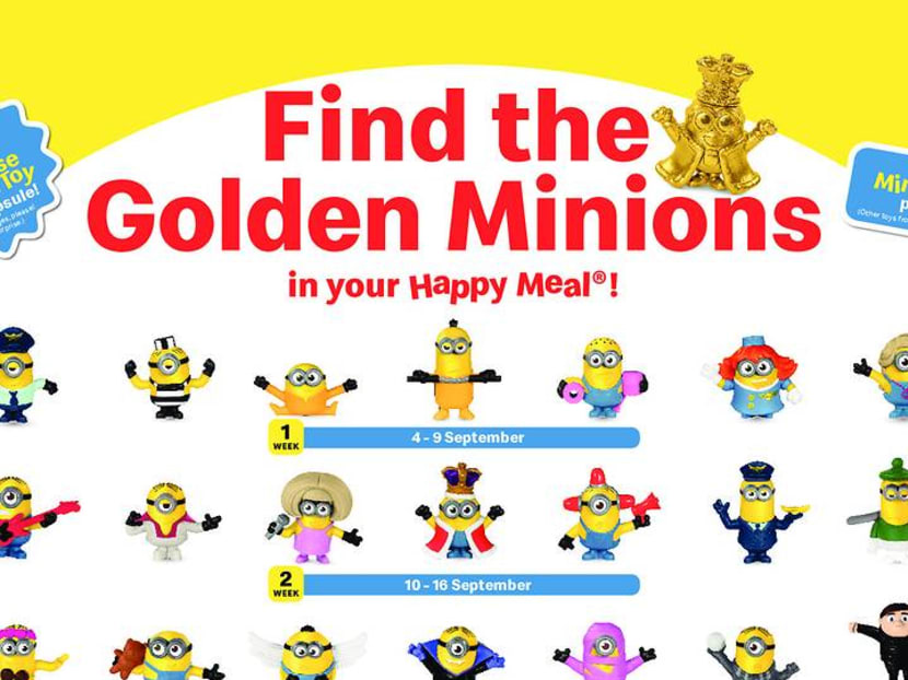 Each Minion will have a unique look (our favourites are the royal Minion and the vampire Minion). Each of the designs also has its own rare ‘golden twin’, so if you’re lucky, you’ll get an all-gold Minion with your Happy Meal instead of the regular one.