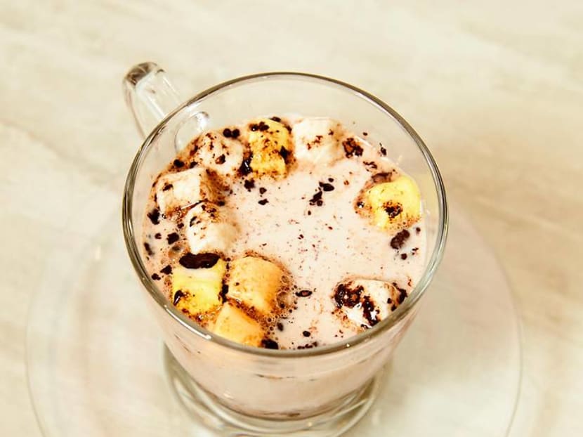 A chocolate orb is dropped into an empty glass, before steaming milk is streamed over it. Slowly, the orbs melt and crack to release either matcha or cocoa powder. We prefer the cocoa one — creamy, Christmassy and not too sweet. As you stir it with a spoon, the chocolatey hit become more