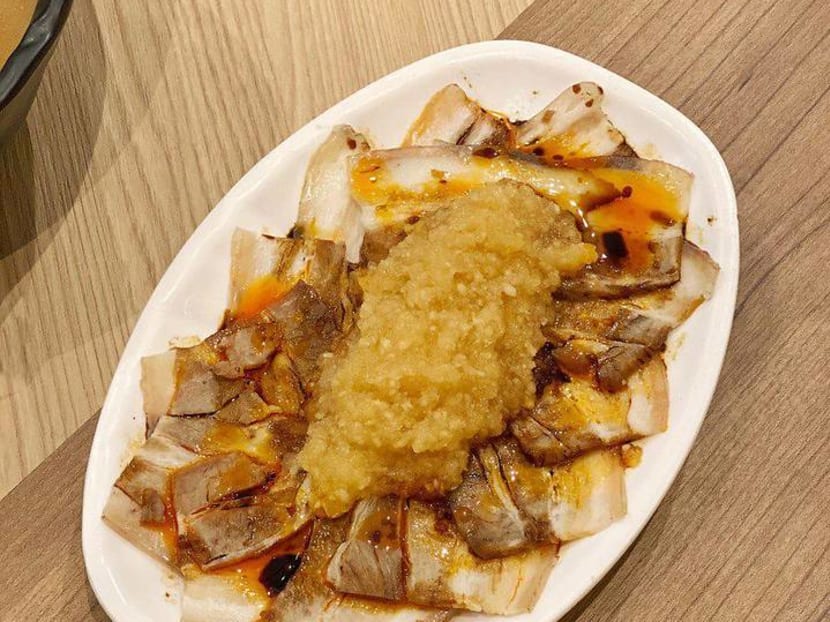 This dish has thin slices of pork belly luxuriating in chilli oil, topped with dollops of mashed garlic. Very shiok, though a tad too oily.