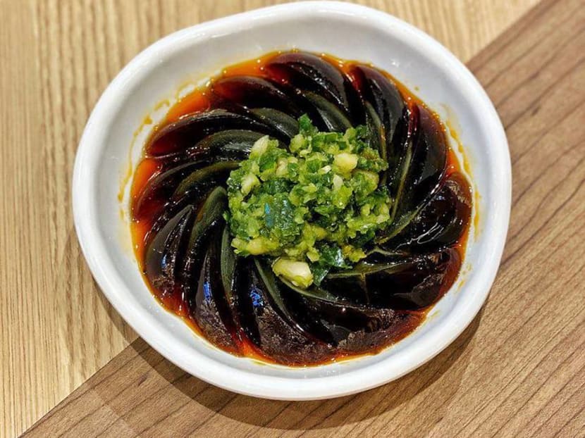 Slices of cold century eggs are arranged in a beautiful sunburst pattern, drenched in a pepper-tipped sauce and topped with green chillies. It's moreish and feistier than the standard pickled ginger served with century eggs, but its flavour gets muted for us after eating a bowl of mixian in fiery broth. Try this before you down your mala soup.