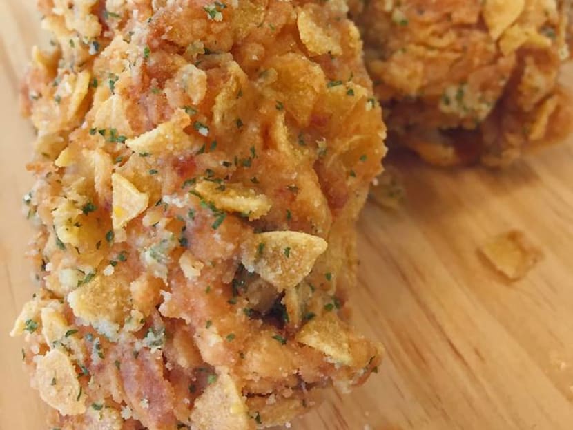 Our golden-brown drumstick and chicken breast are liberally studded with flakes of crushed nacho chips and what appears to be bits of chives. Looks a bit like cornflakes.