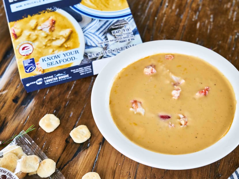An indulgent soup with lobster chunks and cream. Just pop into a microwave oven and slurp away.