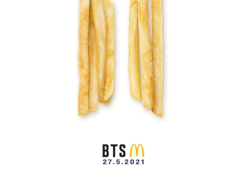 The Golden Arches almost broke the internet when it released this teaser 'poster' of the collab online today (Apr 19), with the BTS logo replaced by McDonald's shoestring fries. Very cute.
