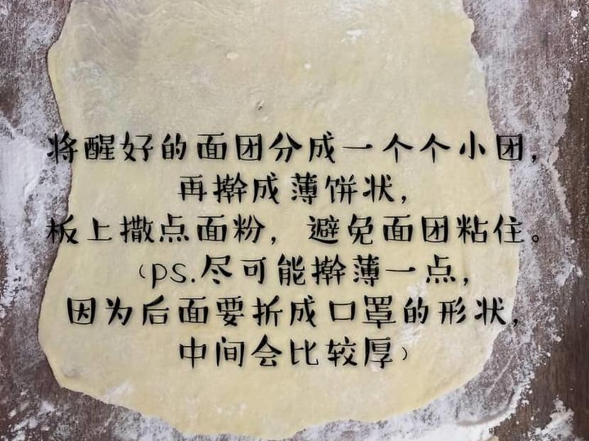 Roll each individual small ball into a flat rectangle shape, and sprinkle some plain flour on it so it doesn’t stick to surfaces. The netizen adds, “Roll [the disc] thinner, as it will become thicker when you fold it into the shape of a mask.”