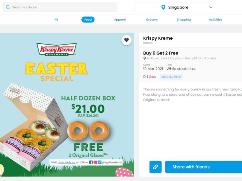 As Gabriel is currently not working with any advertisers, his website is devoid of distracting ads. Instead, the site looks neat, with the deals categorised into five sections: Food, Apparel, Grocery, Shopping and Activities. At a glance, you can browse the deals, plus its main terms and conditions, just by scrolling. When you click on a deal that catches your eye, details such as the promotional duration and shop locations are listed on a single page.