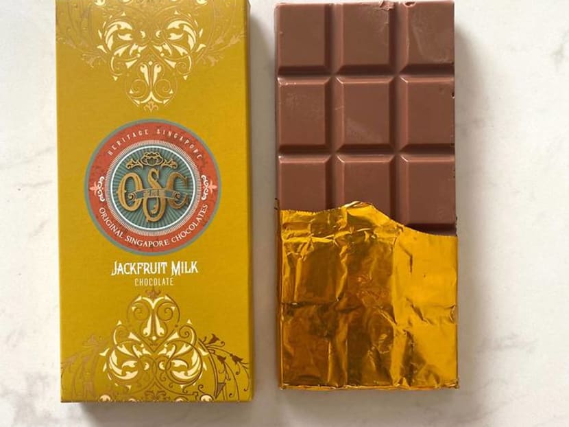 Like the durian bar, the same milk chocolate is flecked with freeze-dried jackfruit bits. It’s surprisingly pleasant as the sweet-pungent jackfruit somehow complements the flavour of the chocolate. As far as novelty chocolates go, this one is a nice surprise.