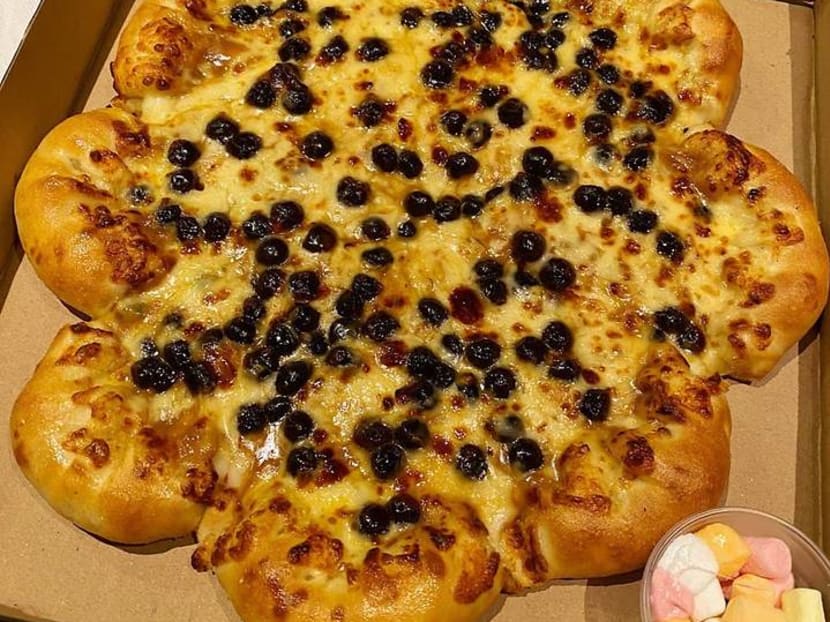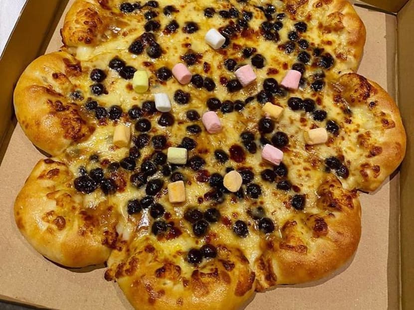The flower-shaped Bubble Tea Blossom Pizza consists of a classic thick crust mozzarella cheese pizza topped with “chewy bubble tea pearls, bouncy little marshmallows and a sweet and delicious brown sugar milk tea sauce”.