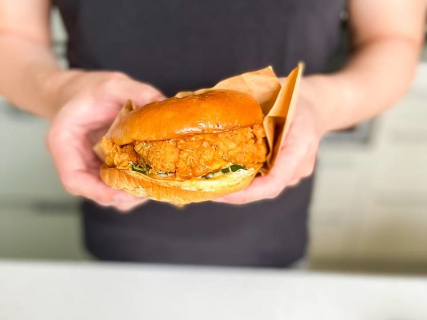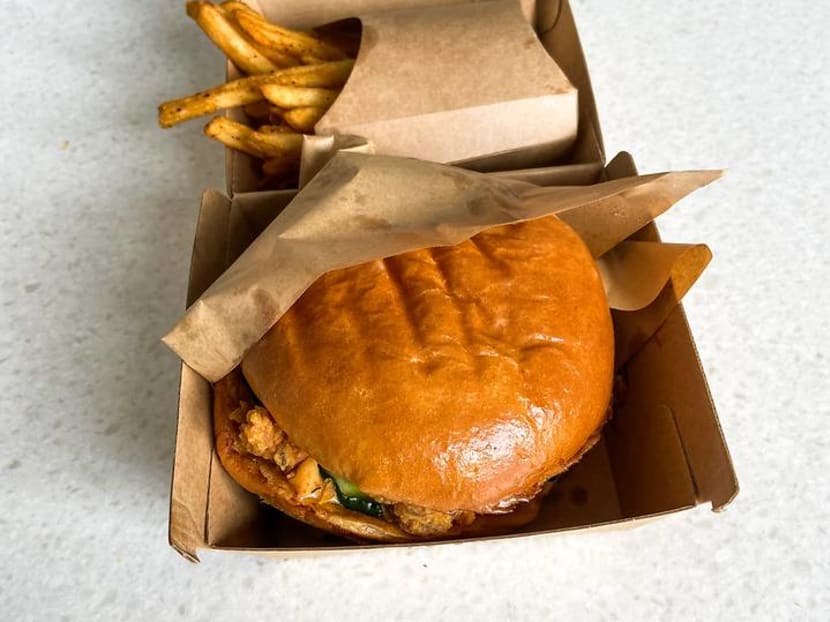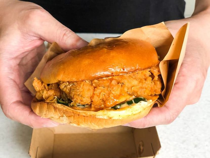 Surprisingly pillowy, plush brioche — it's somewhat reminiscent of those found in artisanal bakeries, minus the atas butter. And it remained fluffy even after being exposed for 10 minutes while we snapped photos. All the PR rep would say when we asked if the buns are sourced in Singapore or imported from America was: “It’s a secret”. What of the chook? Very tender, slightly fatty meat saturated with juices and salty-spicy flavours. We’d prefer the bird to be a little less soft (it was so soft we didn’t have to chew much, which means it might've been over-brined or over-tenderised), but we’d still much rather have this over stringy breast meat. The batter is moderately crispy (we had our sarnie delivered, it should be crispier eaten on-site at the restaurant), and smothered with a tasty but tongue-searing Cajun mayo sauce that had us gulping water between bites. Apparently, the sauce has been tweaked to be spicier for the SG rendition. We love that the sarnie is uncluttered with useless frills like iceberg lettuce — instead, it’s simply adorned with crisp, fat pickles that are freshly brined here, its tartness providing relief from all that fiery richness.