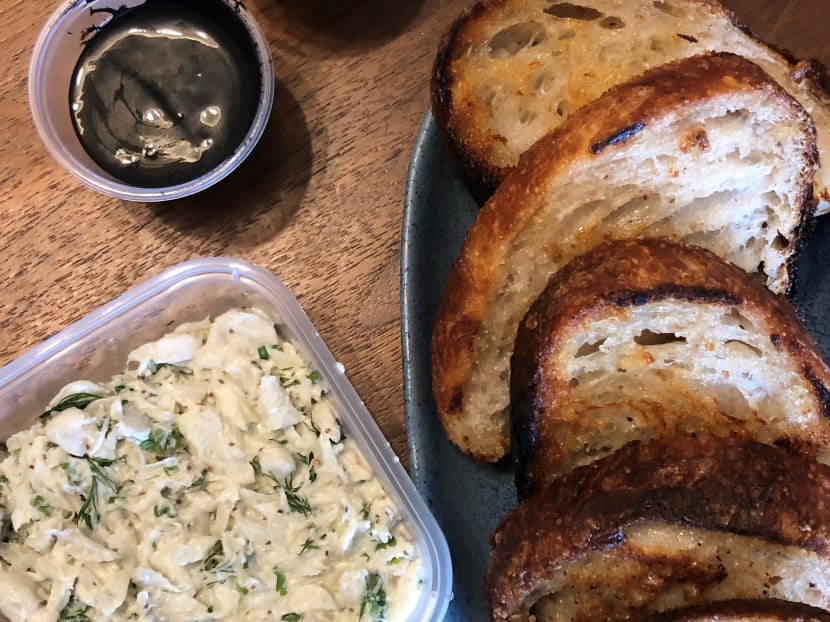 Customer Joy Wan managed to order the Lims’ sourdough the first day it went on sale and collected it from Daniel herself. “He’s tall and shy,” she informs us. Her verdict? The bread is “moist and pretty tasty.” She also adds that she really enjoyed the crabmeat and squid ink mayo slathered over the crusty slices.