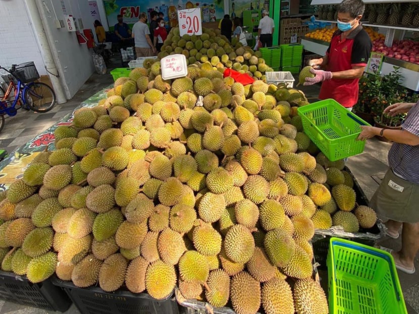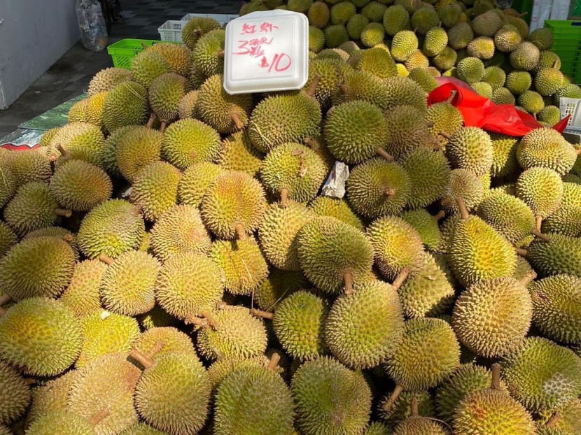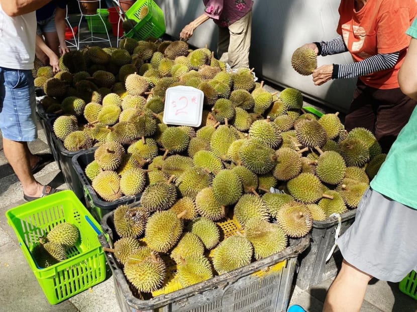 Supermarket chain Sheng Siong now also sells durians at its Bedok Central branch. On its Facebook page, Sheng Siong posted photos showing mountains of durians piled outside the supermarket.
