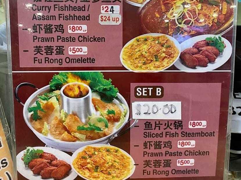 But what catches our eye is a little sign advertising two meal sets. Set A ($32) consists of Curry/Assam Fishhead (usual price $24), Prawn Paste Chicken (usual price $8) and Fu Rong Omelette (usual price $5), while Set B ($20) has Sliced Fish Steamboat (usual price $8), Prawn Paste Chicken and Fu Rong Omelette.