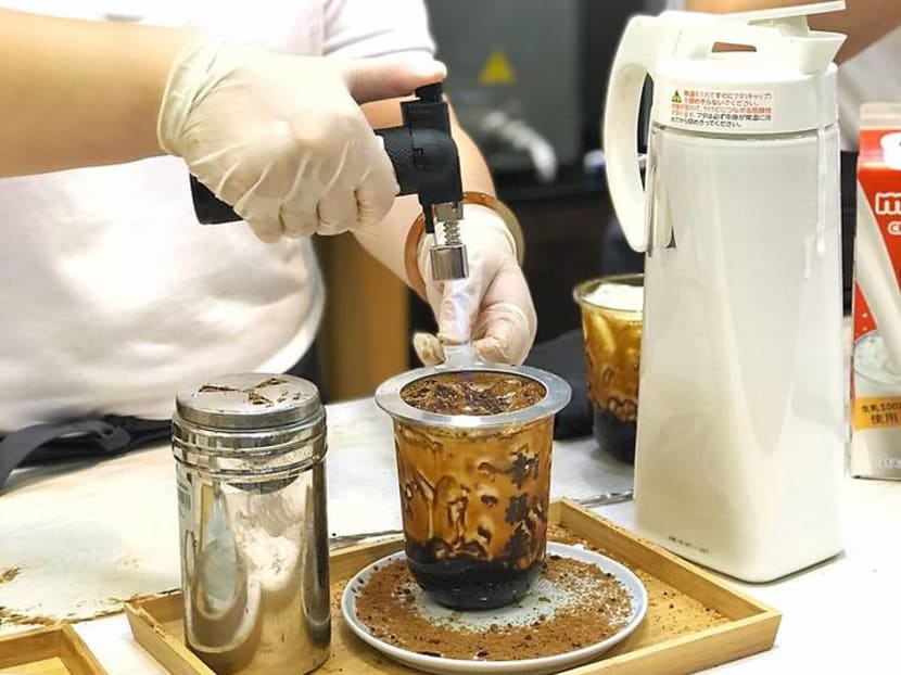 A Xing Fu Tang staff member makes each drink order by hand. The Damascus Rose Tea with Lemon is painstakingly adorned with lemon slices in a rose shape (though it’s sadly obscured once the plastic lid goes over the cup). The Brown Sugar Boba Milk is more elaborate: a generous sprinkling of brown sugar is poured over the milk, whipped cream and brown sugar pearls concoction before being blow-torched till it’s caramelised.