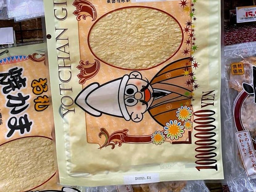 It costs — not a million bucks — but $5.90 for a sheet. The parody money is manufactured by Japanese seafood snackmaker Yotchan Foods, which explains why there’s a ‘Yotchan Ginzo’ (Japanese for Yotchan Bank) emblazoned on one side of the banknote. We also giggled at the authoritative-looking obverse of a man wearing a squid hat. Very clever.