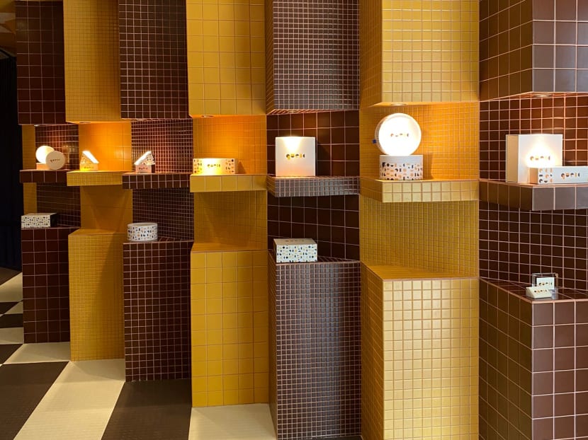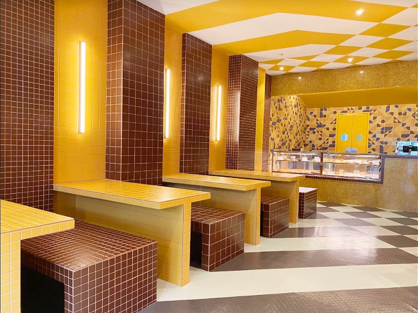 The chic cafe is dominated by mustard and brown tiled walls, tables, and bold black-and-white patterned flooring.
