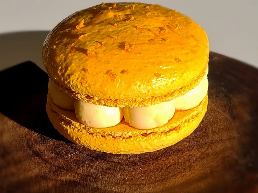 A large macaron stuffed with orange yuzu compote, almond sponge and New York cheesecake filling. Feeds up to two pax.