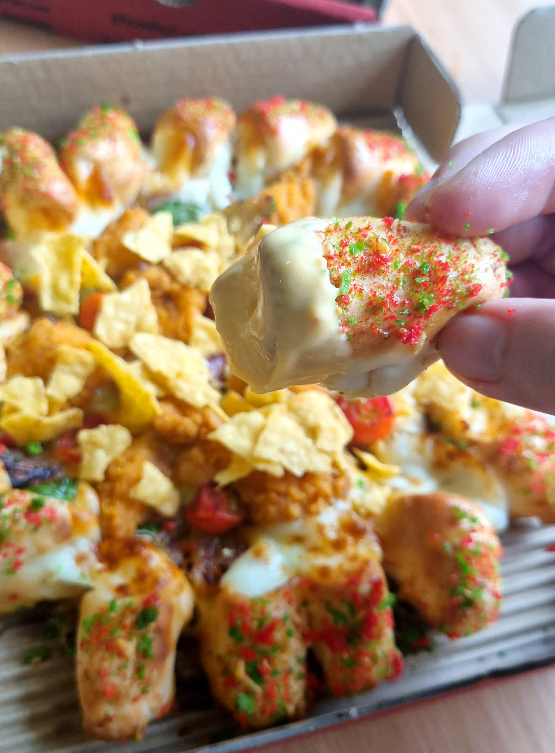 The festive pizza comes loaded with cherry tomatoes, spinach, pineapple, turkey bacon, thousand island sauce, and the star ingredient: moderately-spicy morsels of chicken, breaded and deep-fried for extra crunch. Bolstering said crunch is a further portion of Chachos (tortilla corn chips) to be sprinkled liberally over your pizza if you desire.
