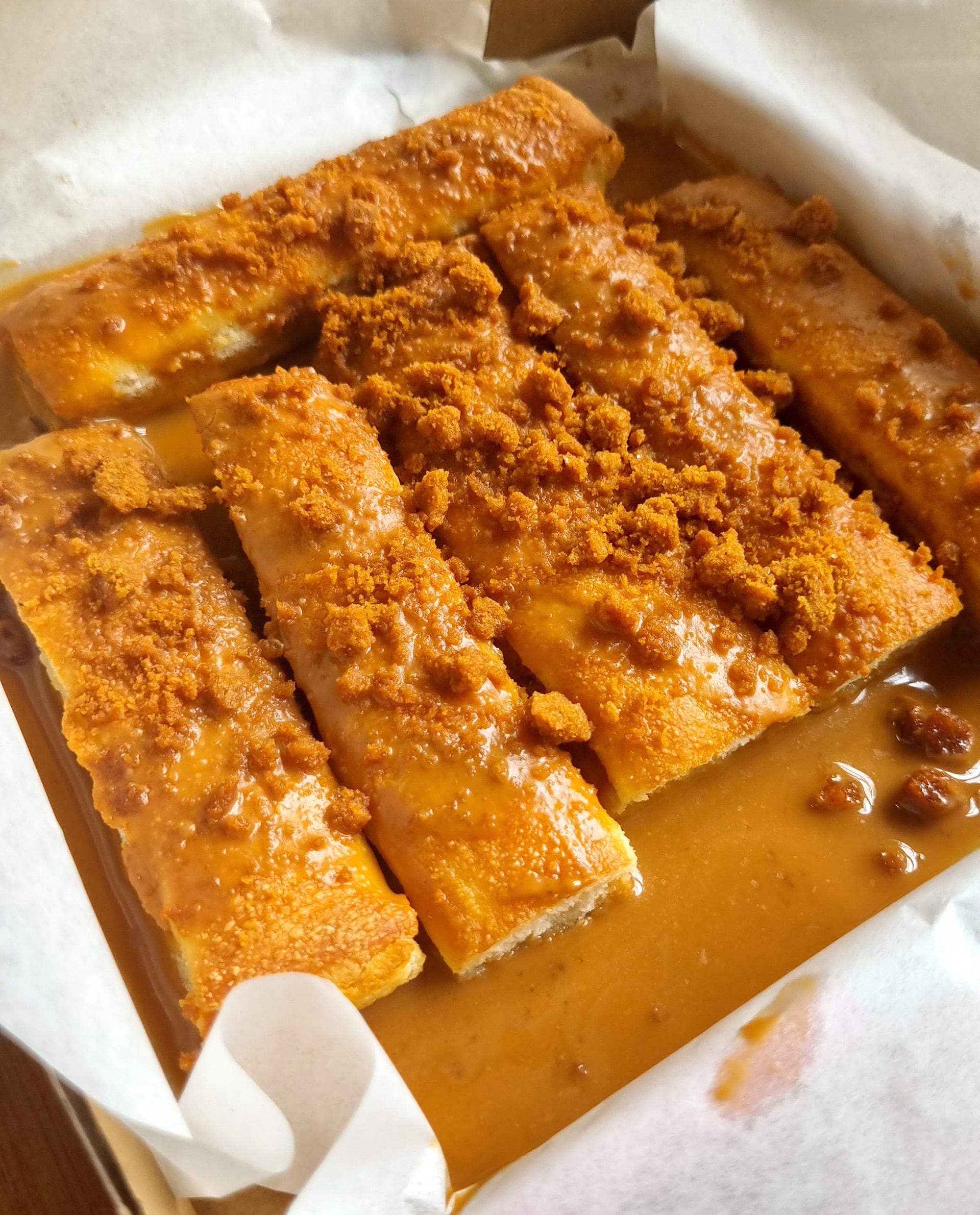 Though the breadsticks are more dense than light and fluffy, they boast an assertive crunch that pairs well with the accompanying heap of Lotus biscoff crumbs. We especially enjoy the dulcet sweetness of the Lotus biscoff sauce that’s soaked into the bottom half of the breadsticks on their journey from kitchen to home. Quite delish.