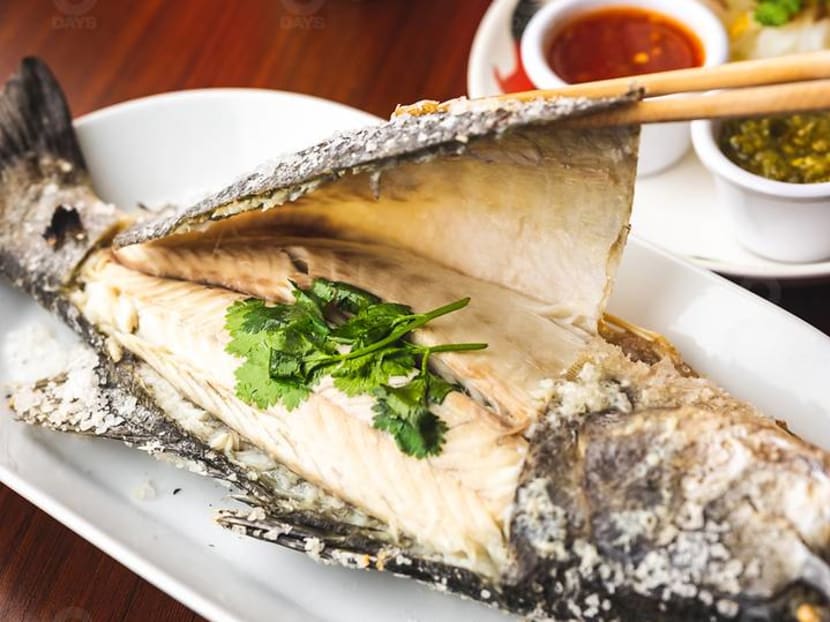 Baked in a salt crust for 30 minutes, the seabass came out perfectly moist and seasoned — you can taste the freshness and natural sweetness of the fish. Eat it on its own or with the accompanying rice noodles dipped in either the garlicky and spicy green seafood sauce or sweet chilli sauce.
