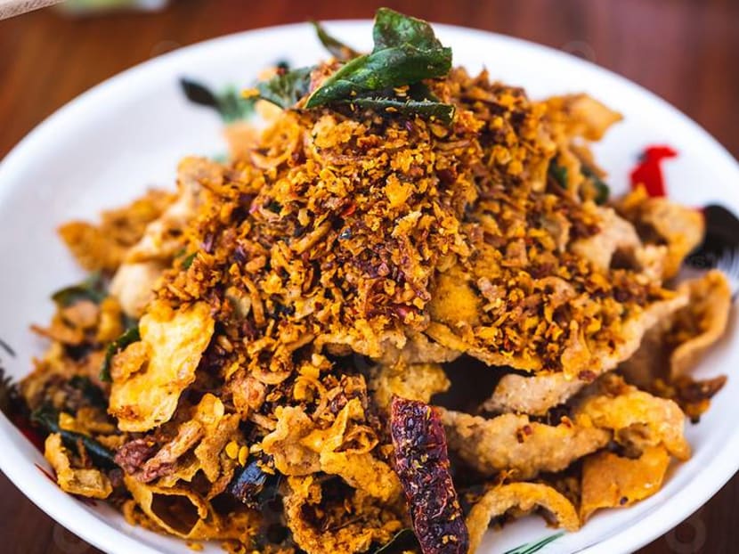 Fat is removed from under the skin before it is deep-fried to a delicious crisp and tossed with fried onions, garlic, kaffir lime leaves and chilli powder. Surprisingly light and not greasy, the spicy slivers are highly addictive and best enjoyed with an ice-cold beer.