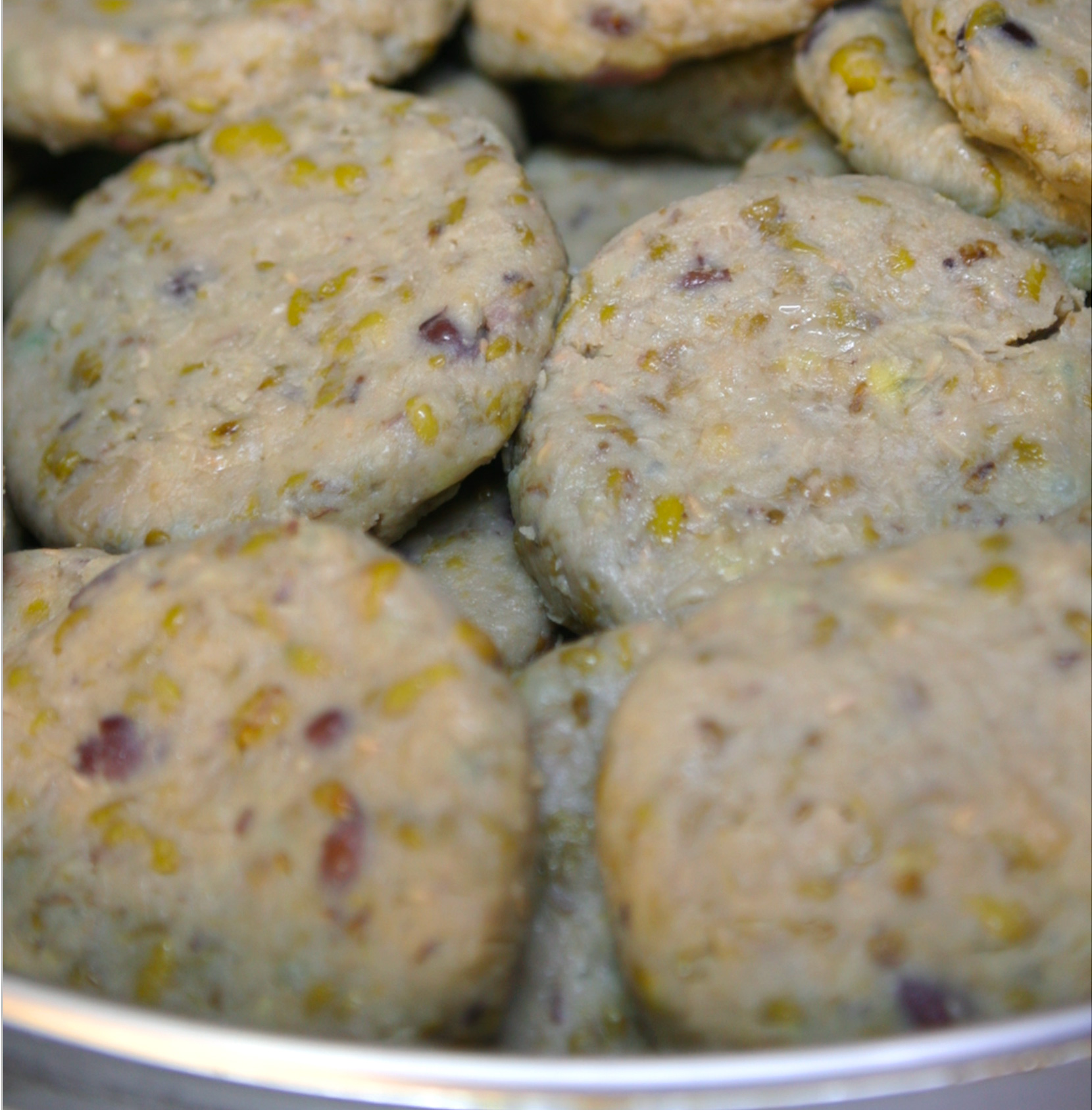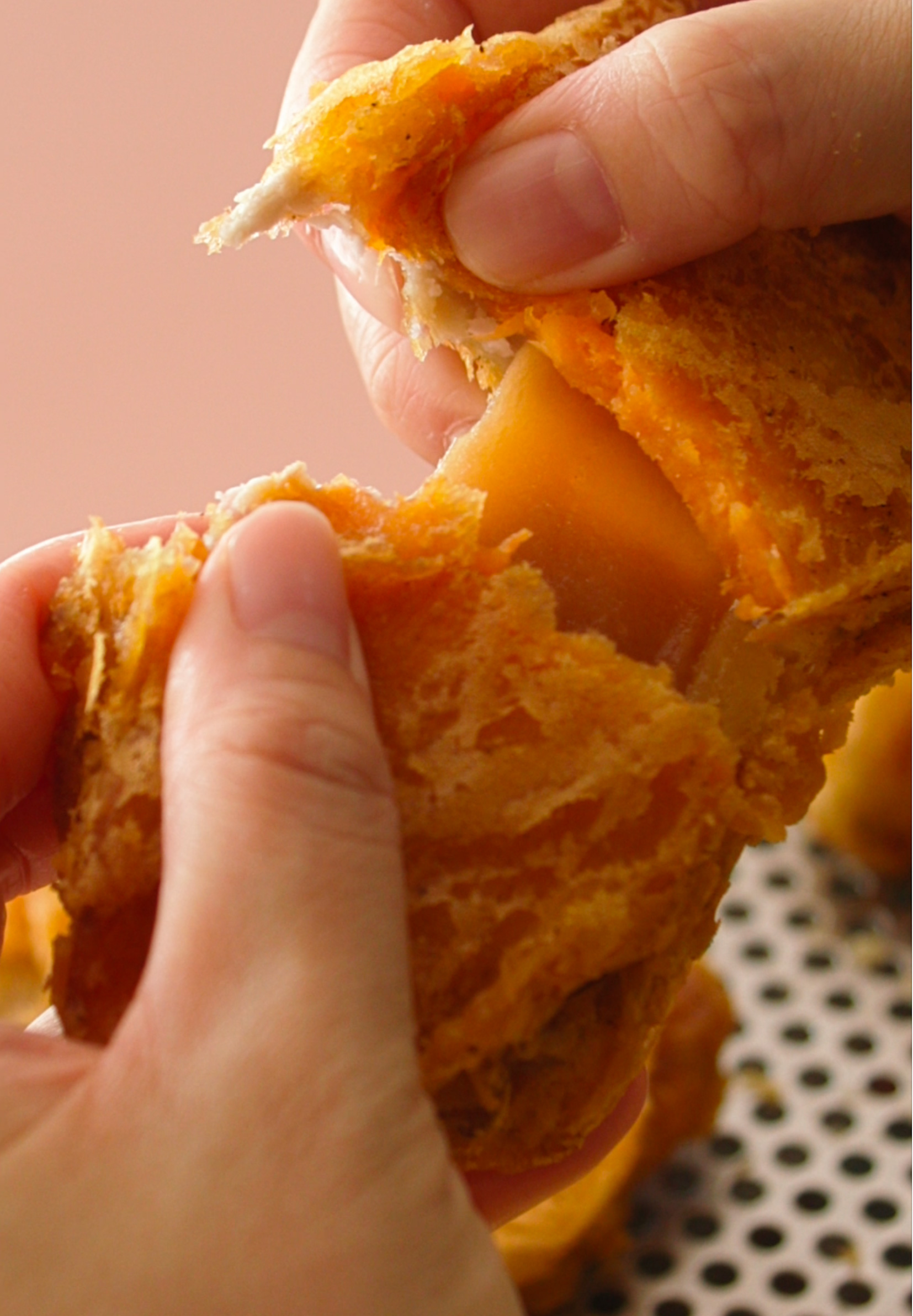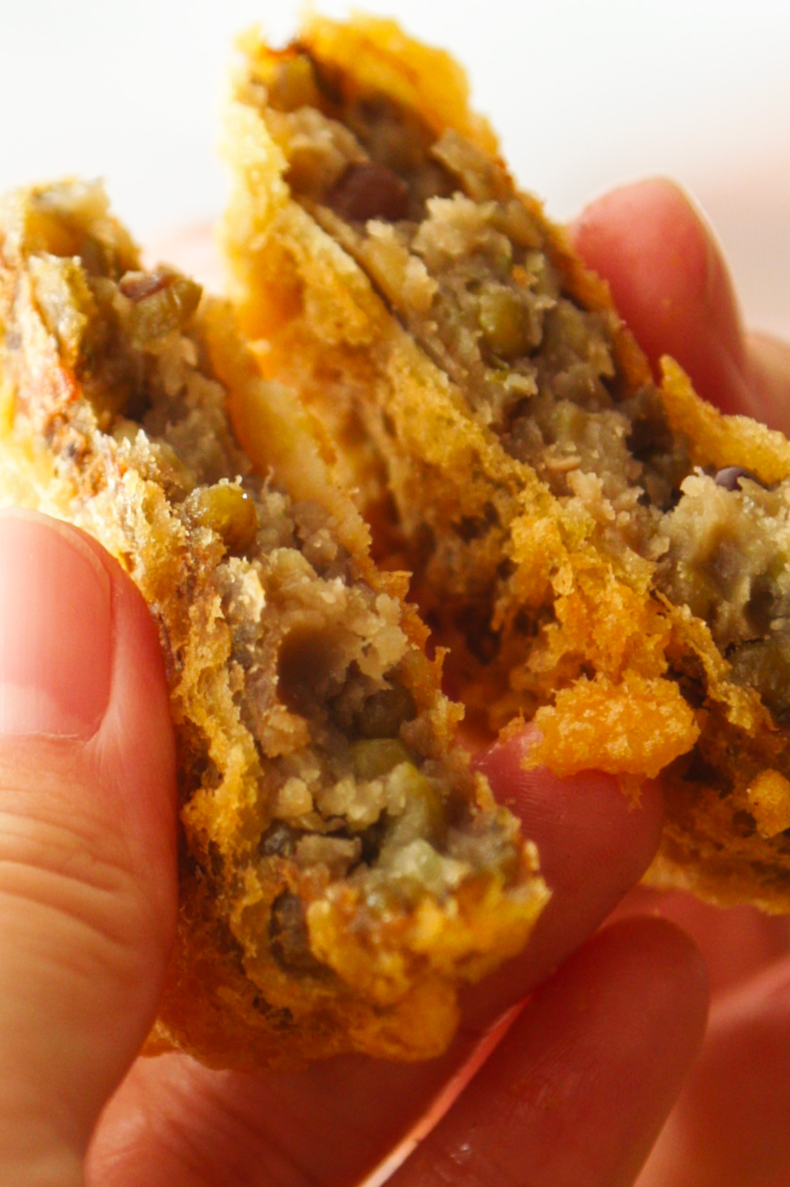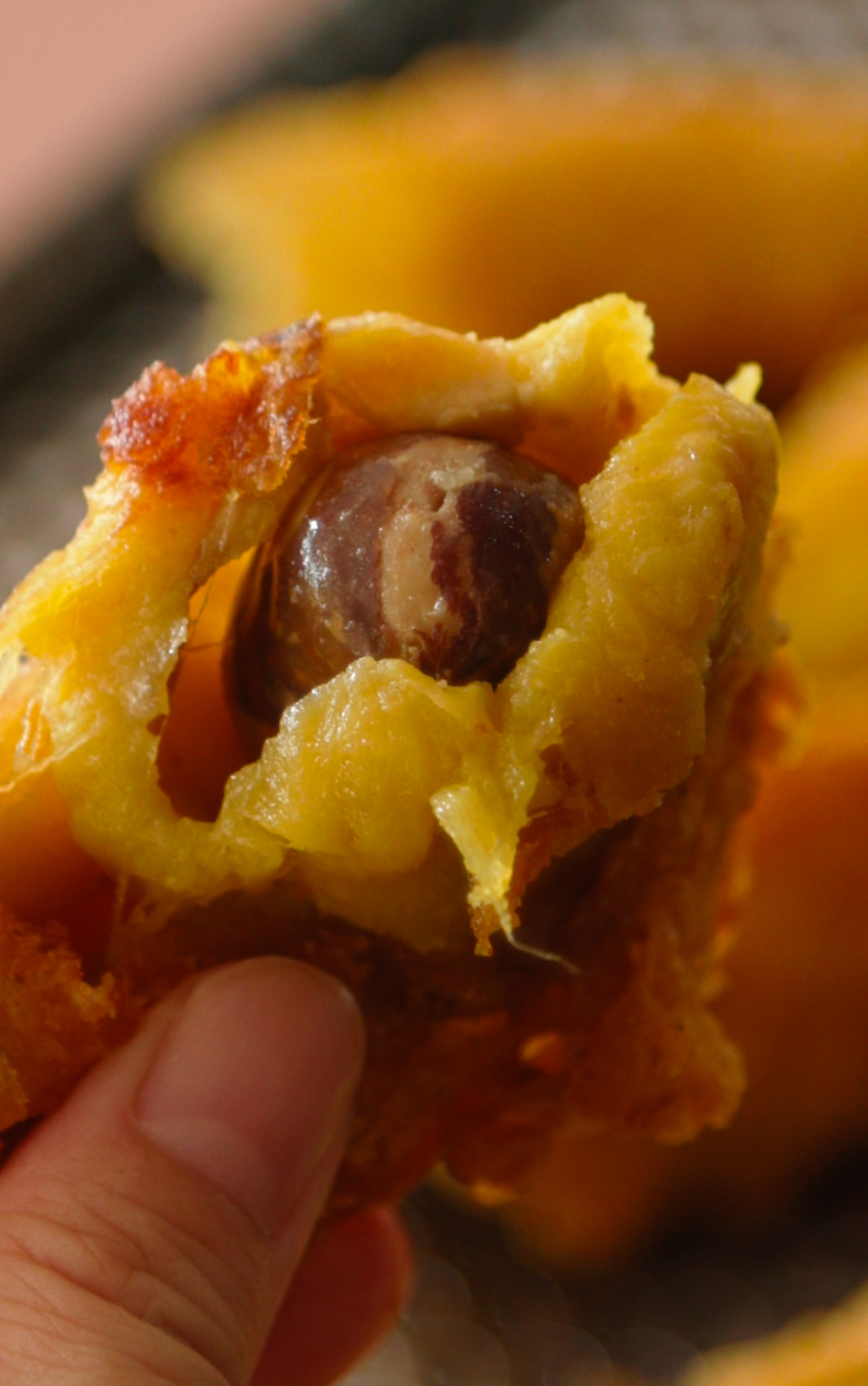 Nana also introduced a unique twist to the traditional green bean fritter, through the incorporation of Chinese food philosophy where balance is key. “Customers say that green beans are too 'cooling’ for the body, so I added red beans (which are ‘warming’ by nature) to my green bean fritters.” Note that green beans here refer to mung beans. Our colleague admits that she is unable to taste the red bean in this munchkin, though we do spot some red speckled amid the green in the filling (see below pic).