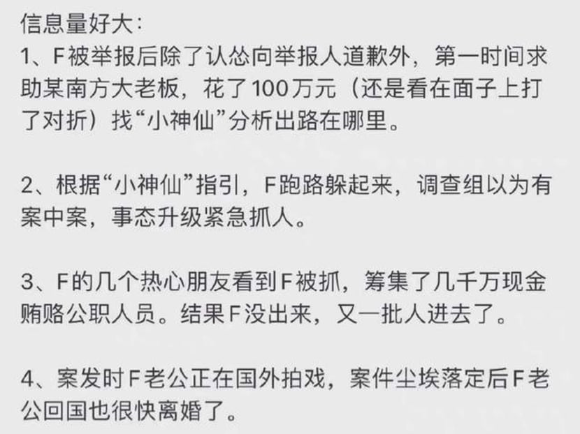 This person told F to hide, but the actress ended up getting caught instead. F’s friends started pooling “tens of millions” to try to buy off those in the government to get her out of trouble, but ended up in hot soup themselves.