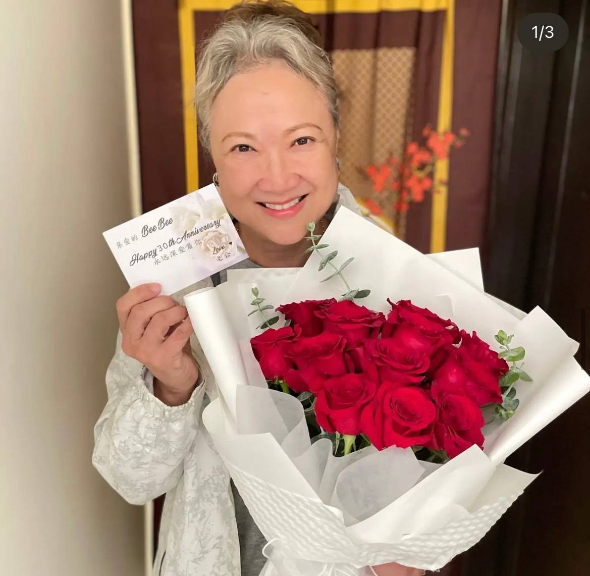 It's true when they say the small things are what keep a happy marriage going. Huifang, who has been working on a drama in Taiwan, received a bouquet of roses from her hubby Geping in celebration of their 30th wedding anniversary.