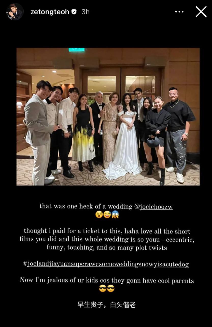 The wedding saw some 380 guests, which included many of Joel’s and his dad Zhu Houren’s celeb pals, including Rayson Tan, Chew Chor Meng, Aileen Tan, Kym Ng, Paige Chua, Felicia Chin, Jeffrey Xu, Darren Lim, Evelyn Tan, Hazelle Teo, Zhong Kunhua, and Zhang Zetong.