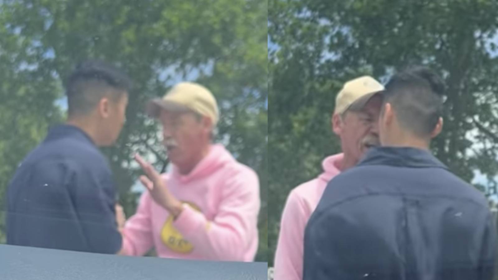 In the video, a man dressed in a pink hoodie can be seen gesturing aggressively, swearing, and yelling insults at Joshua. The situation appeared to be very heated while the couple’s pet dachshund seemed to be whining in fear in the background as well.