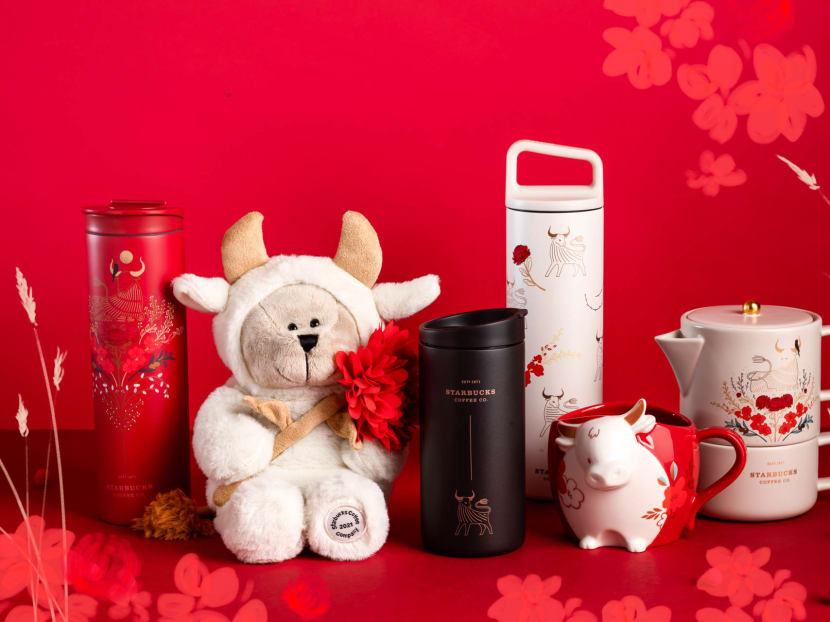 Un-bull-ievably cute is a whole herd of ox-themed merch from Starbucks. From left: Red tumbler, $45.90, Ox Bearista, $38.90, Charcoal tumbler, $41.90, White tumbler, $49.90, Ox mug, $24.90, Teapot and cup, $62.90.