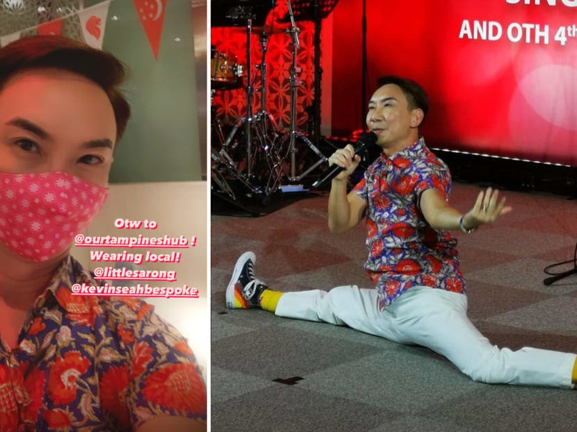 Hossan hosted the National Day Tampines Together Concert and rocked it a floral print shirt from local brand Kevin Seah Bespoke and a cute sarong mask.