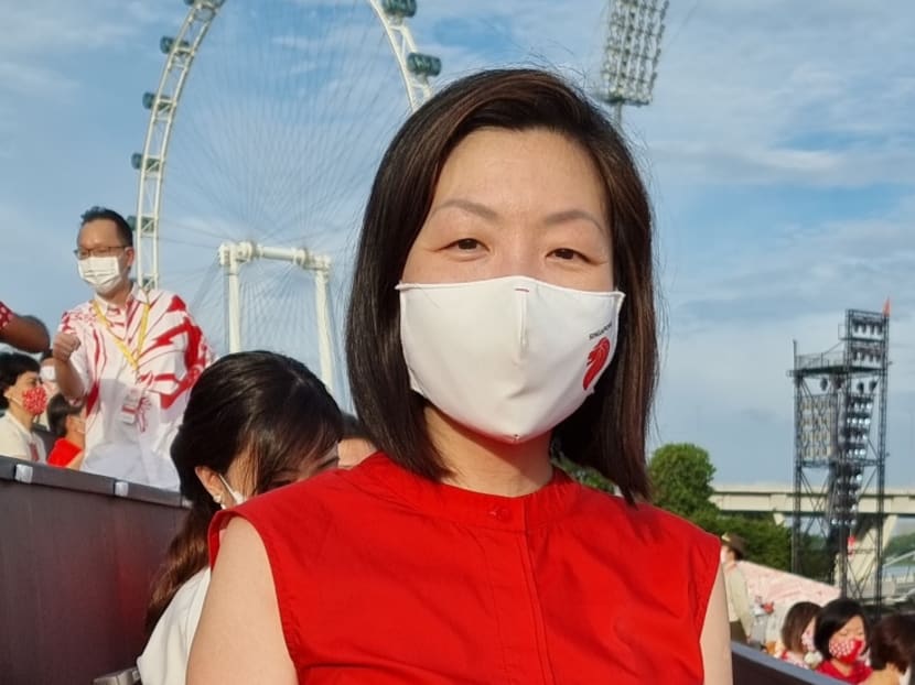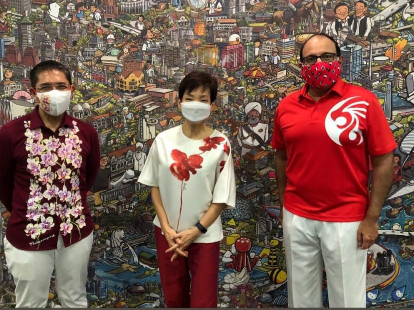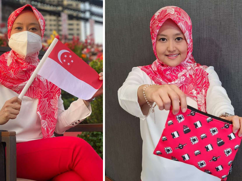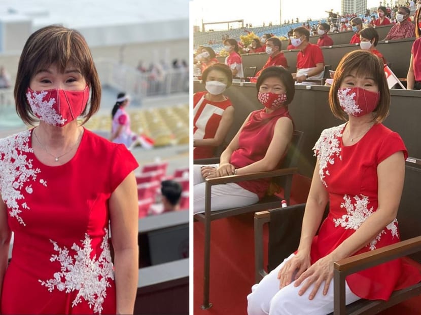 Accessories game strong. Parliamentary Secretary for Communications and Information Rahayu Mahzam jazzed up her simple white and red get-up with an orchid print scarf and pouch inspired by Singapore transportation from social enterprise Singapore Fashion Runway. They have matching masks and tees too.