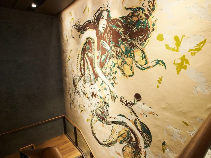 Singapore-based artist Sean Dunston spent two months hand-chiselling the Starbucks Siren onto the wall leading up to the second storey, and included a couple of subtle references to Singapore culture — the Siren’s brocade is decorated with Peranakan patterns and she has a Vanda Miss Joaquim orchid tucked behind her ear.