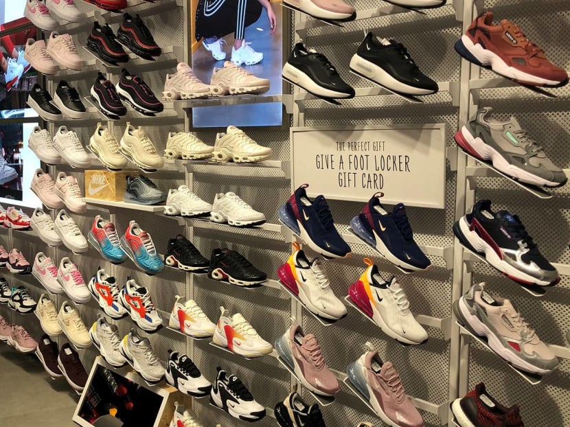 The ladies' sports shoe rack has the most number of pink sneakers we've ever seen on sale in a single shop. Win.